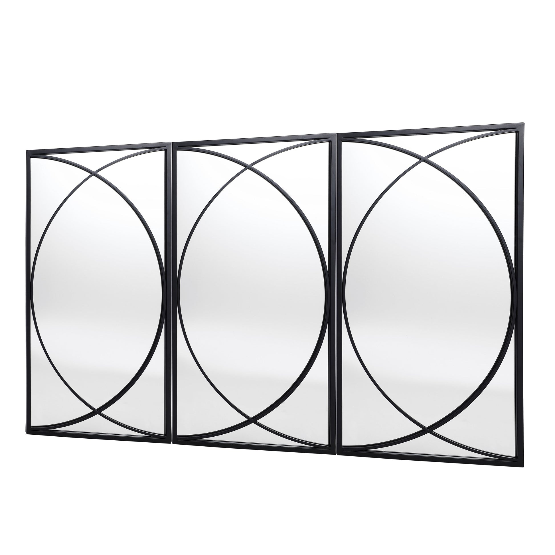 Sublimez votre espace de vie avec ces miroirs muraux rectangulaires en métal noir de qualité supérieure. Cet ensemble comprend trois miroirs au design contemporain, à disposer ensemble ou séparément pour personnaliser votre décoration. Leur surface en verre de haute qualité offre des reflets cristallins, parfaits pour un usage aussi fonctionnel que décoratif. Leur design moderne et élégant, composé de deux demi-cercles se croisant au milieu, vous permet de les agencer selon vos envies et votre créativité.
