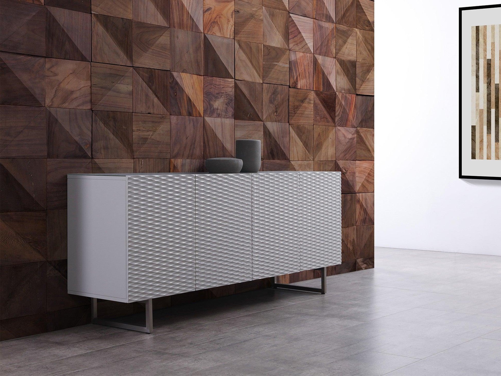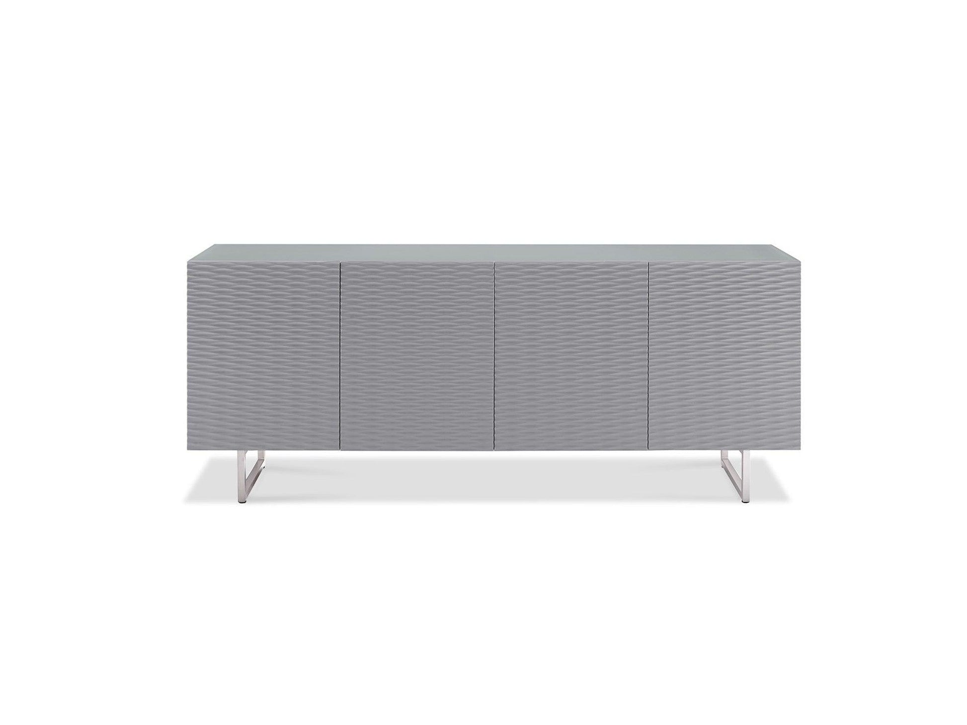 The luxurious decor of this buffet will add elegance to any space. Features include a high gloss tempered glass top; wave textured doors, and beautiful metal legs with a brushed nickel finish.
