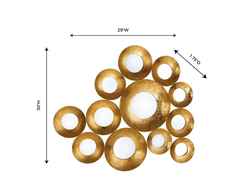 Description: Featuring a distressed golden finish and beveled frames, these twelve multisized mirrors come together to create a stunning piece.