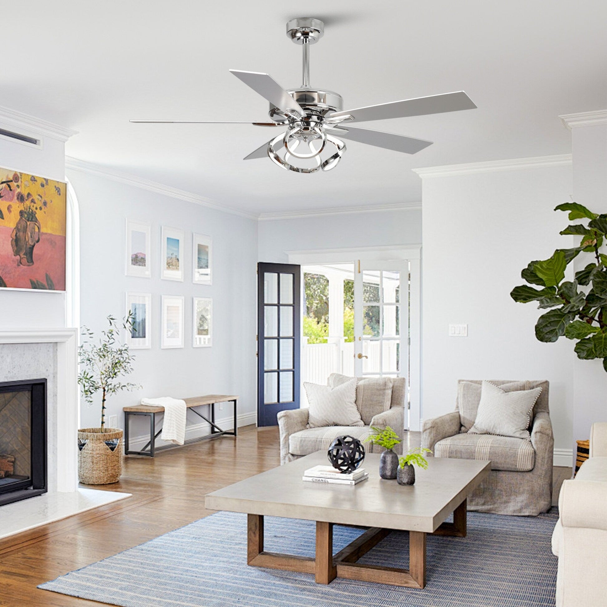 Rafraîchissez votre intérieur avec ce ventilateur de plafond LED chromé de 132 cm, avec éclairage et télécommande, conçu pour allier élégance et confort tout au long de l'année. Ce luminaire est doté d'une bande lumineuse LED intégrée à motif torsadé unique, alliant modernité et fonctionnalité. Ses cinq pales réversibles argentées et marron foncé offrent un style polyvalent, tandis que son moteur CC silencieux à 6 vitesses délivre un flux d'air puissant jusqu'à 3920 pi³/min. L'éclairage LED intégré de 24 W offre trois températures de couleur (3000 K/4000 K/6000 K) avec une luminosité réglable, vous permettant de contrôler totalement l'ambiance de la pièce. Une télécommande pratique permet de régler facilement la vitesse, l'éclairage et le mode marche arrière pour un confort optimal tout au long de l'année. Idéal pour les salons, les chambres ou les espaces ouverts, ce ventilateur s'intègre parfaitement aux styles campagnard, transitionnel et contemporain.