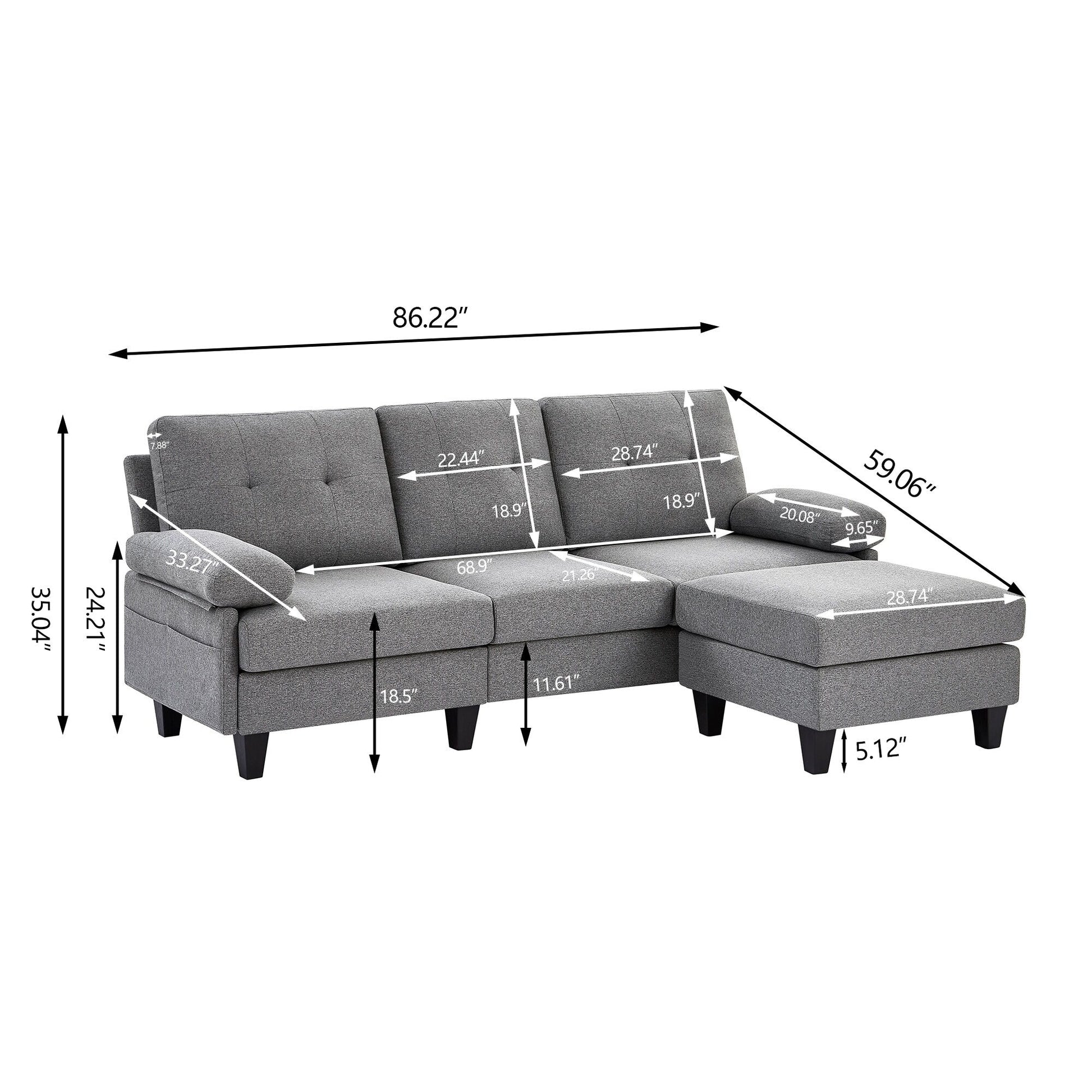 Canapé sectionnel en L 86,22 pouces avec poches de rangement latérales