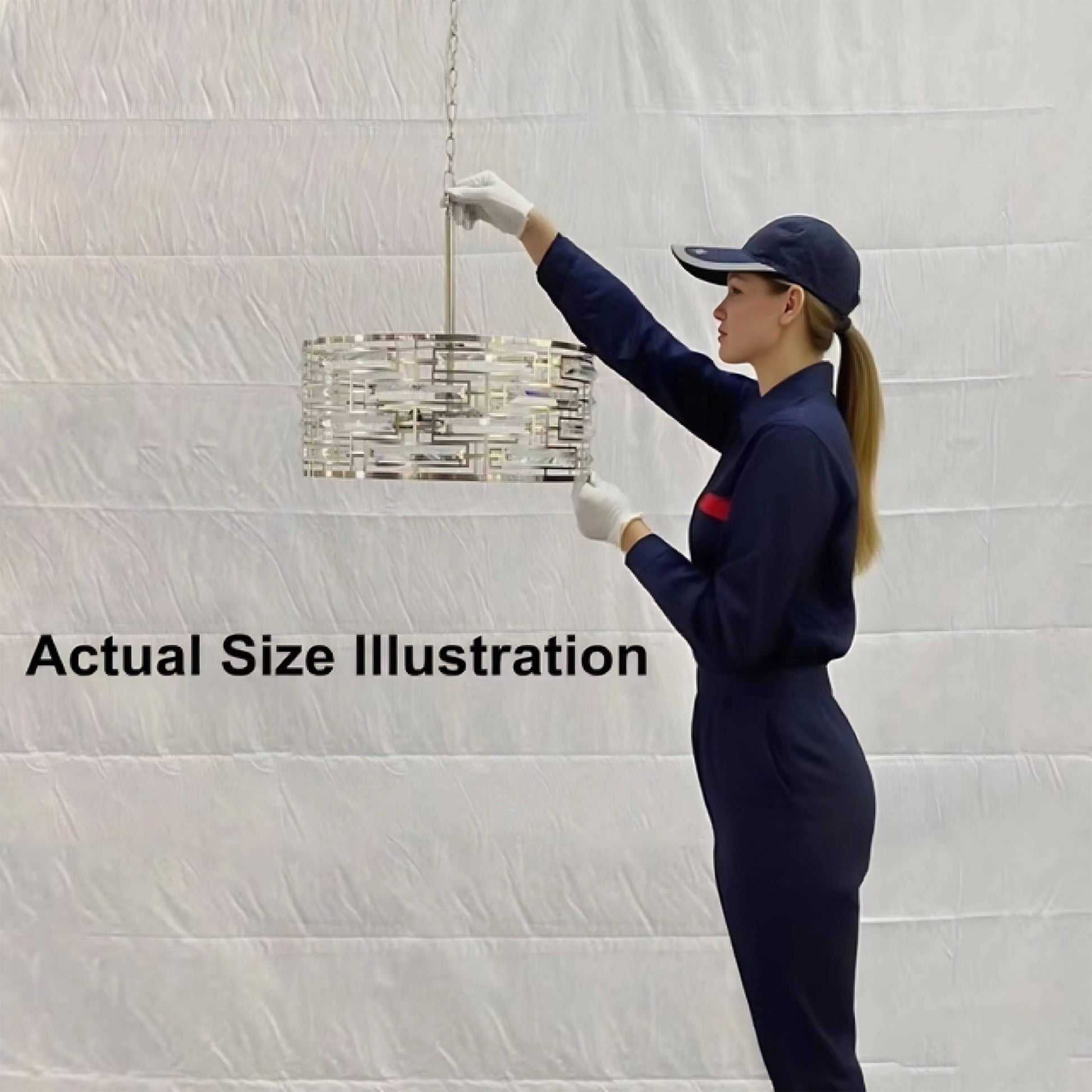 - Luminaire : 20 pouces de diamètre x 18 pouces H ; Abat-jour : 20 pouces de diamètre x 8,5 pouces H ; Plaque de plafond : 5,1 pouces de diamètre x 1 pouce H ; Hauteur de suspension maximale (du plafond au bas du luminaire) : 59,4 pouces, qui peut être raccourcie.
