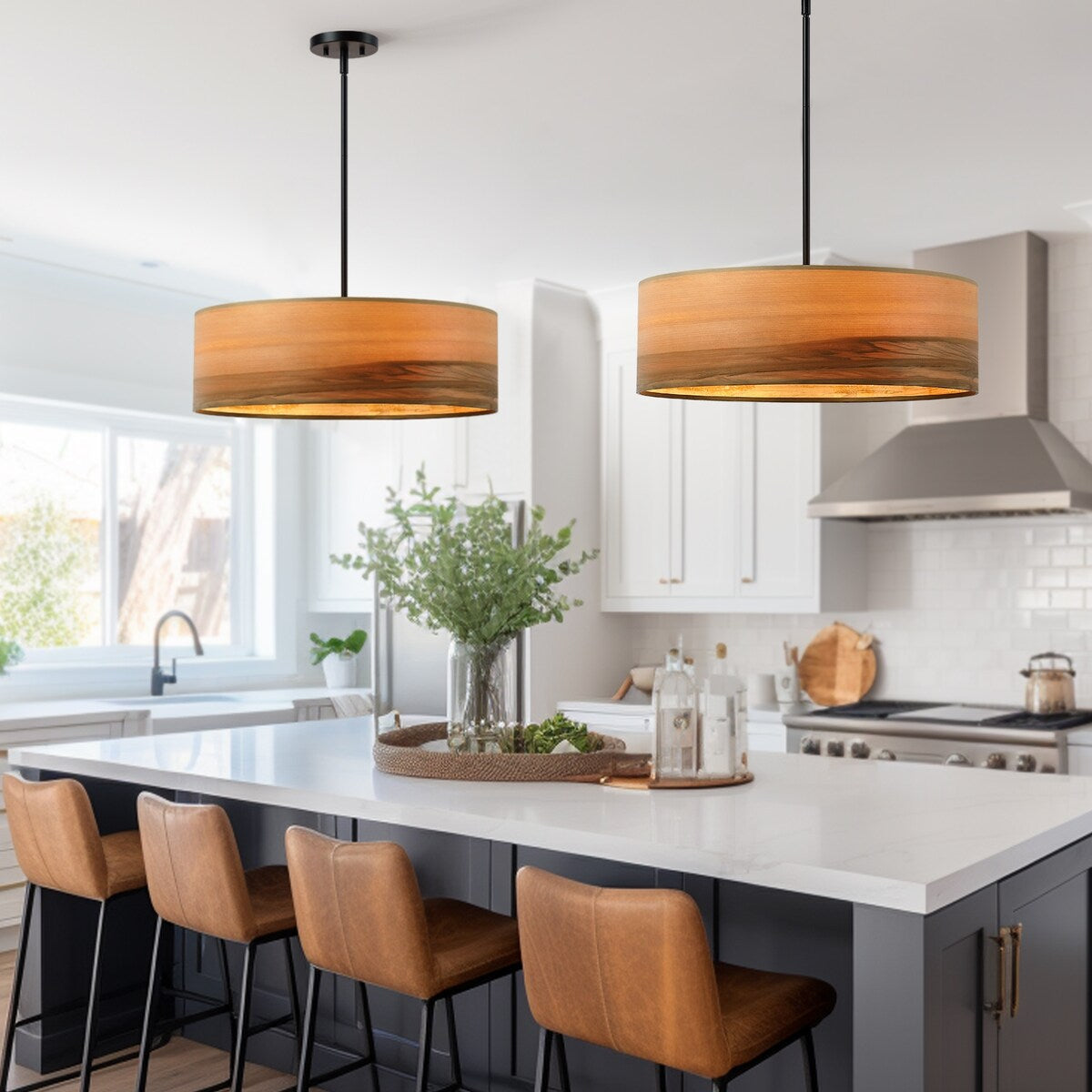 Lustre tambour Breaux à 4 lumières en placage de bois avec auvent noir - 22 po de largeur