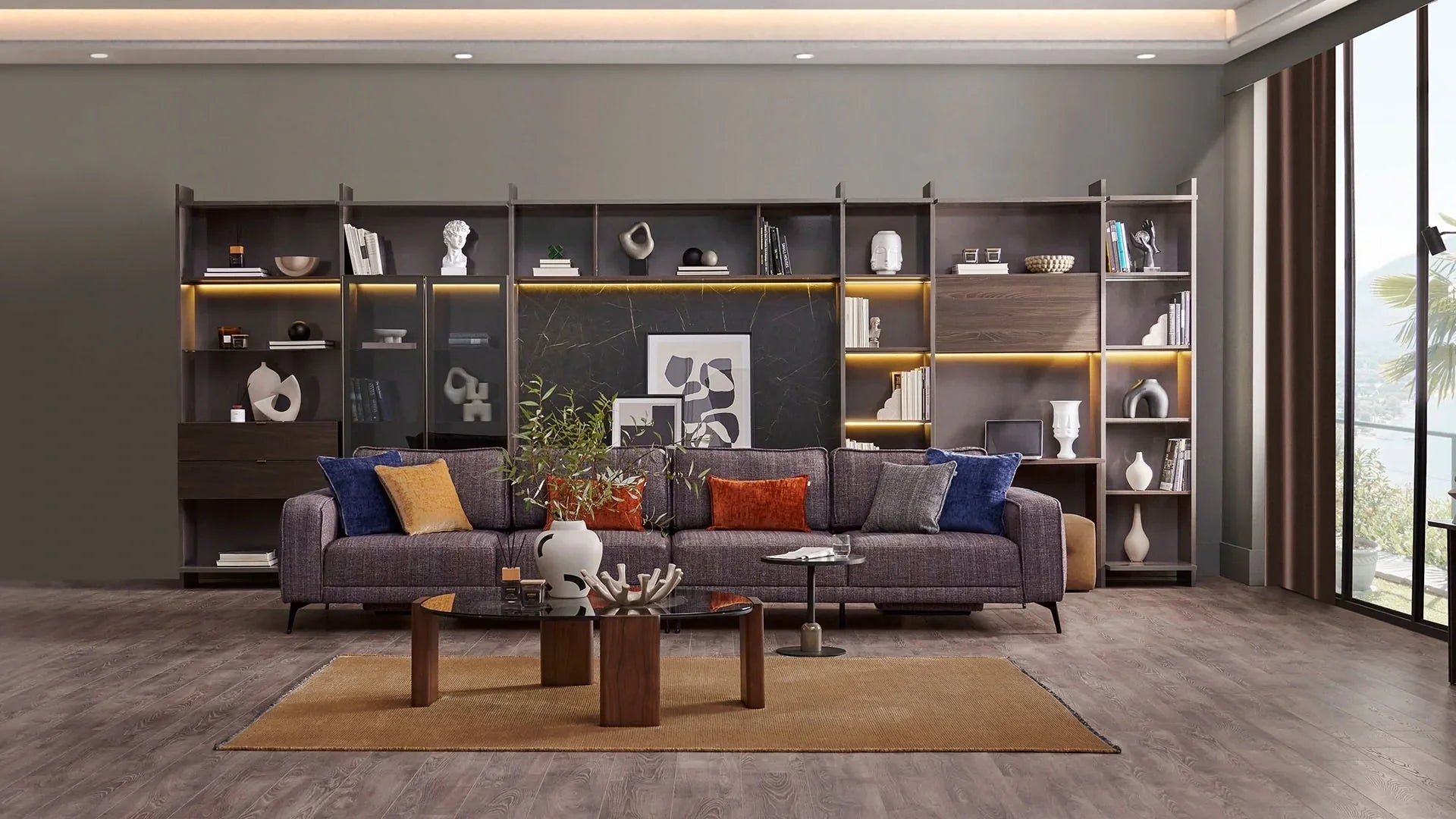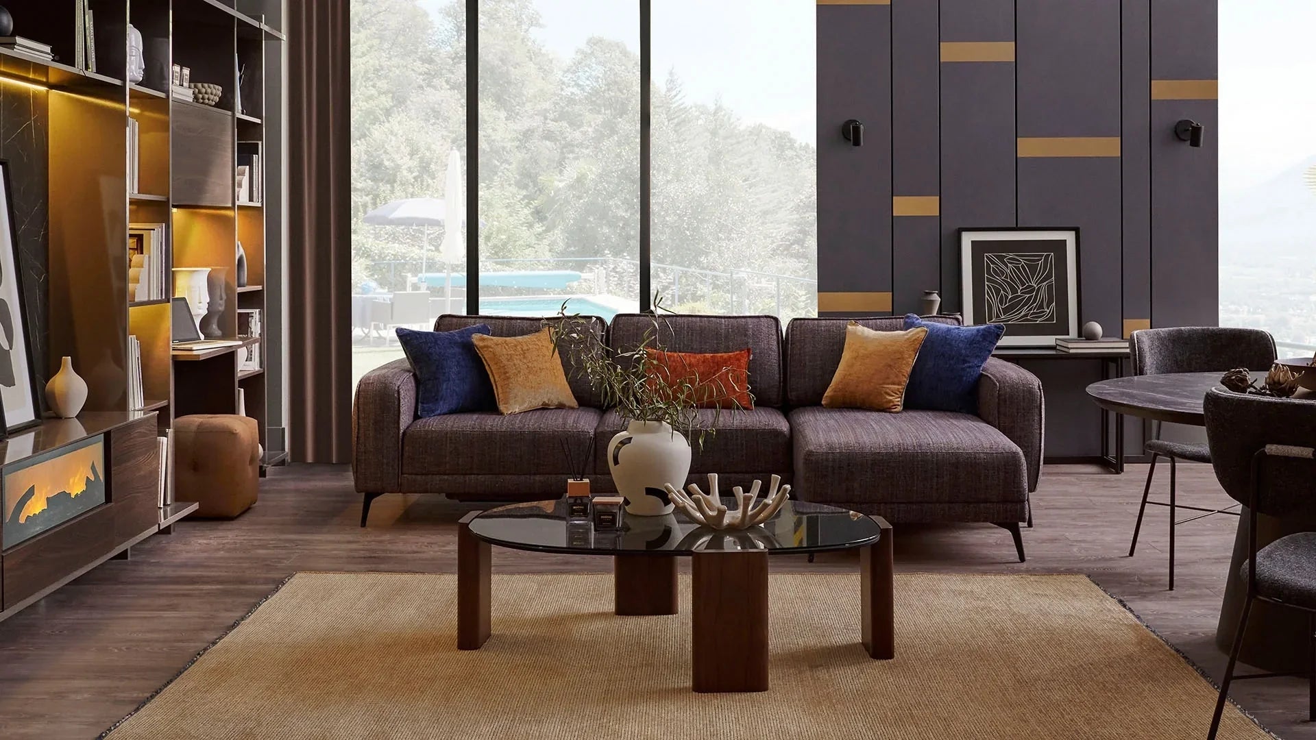 Le module deux places inclinable Flexa, orienté vers la gauche, allie confort et modernité dans un design épuré. Doté d'une structure hybride bois-métal robuste et revêtu d'un tissu chenille tissé multicolore, ce canapé allie durabilité et charme esthétique. Son appuie-tête fixe intégré et sa mousse haute densité 35 DNS offrent un soutien et une détente optimaux. Agrémenté de coussins chenille bleu marine et jaune, il est idéal pour les espaces de vie modulaires.