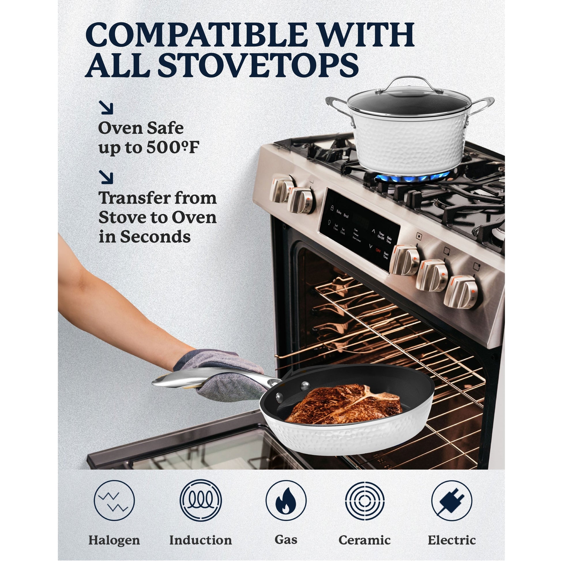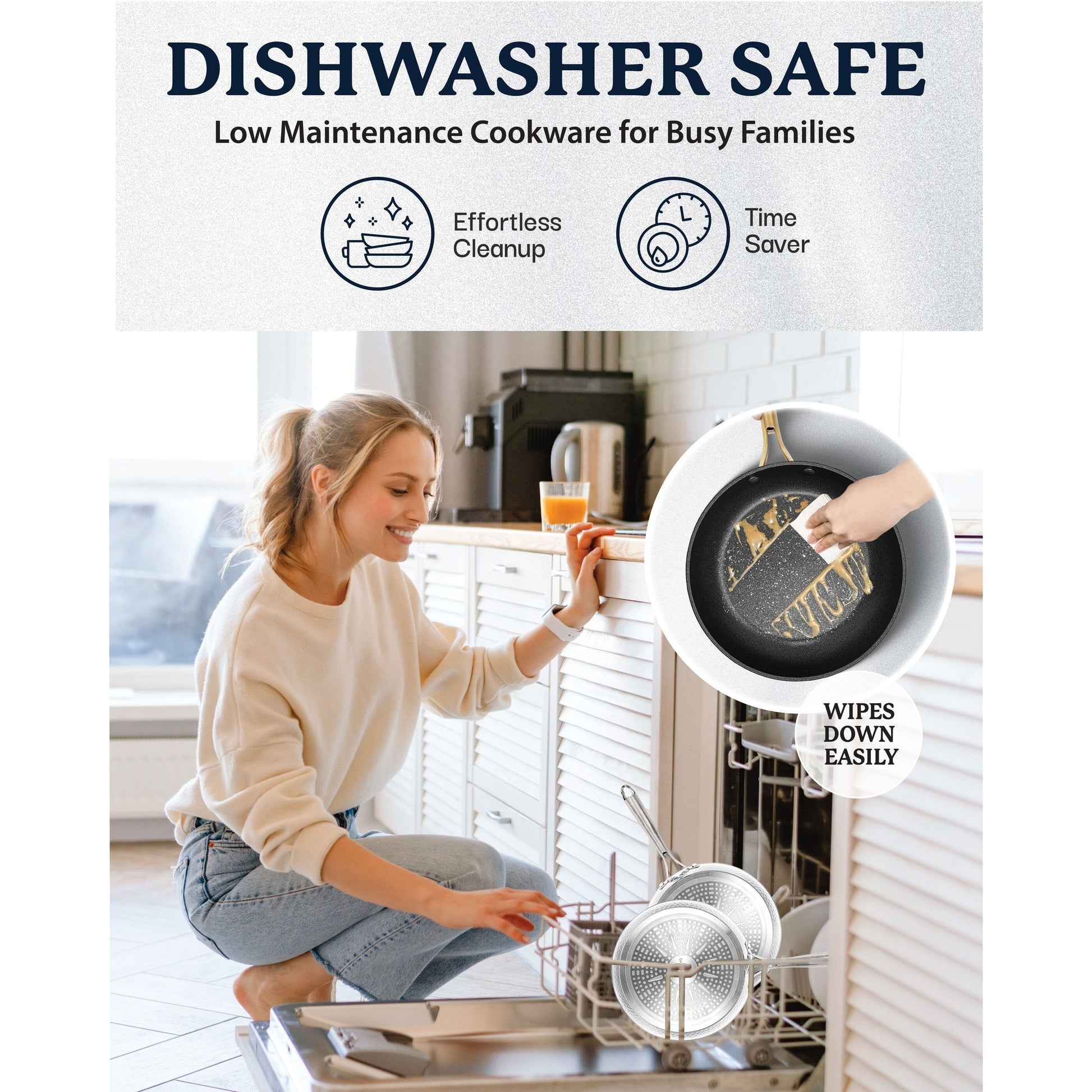 Réinventez vos dîners de semaine avec la batterie de cuisine Granitestone Charleston, 10 fois plus durable et ultra-résistante. Cet ensemble de 15 pièces comprend une poêle de 2,4 m, une poêle de 3 m avec couvercle, une casserole de 1,5 l avec couvercle, une casserole de 2,5 l avec couvercle, une marmite de 5 l avec couvercle, un panier vapeur en acier inoxydable et un ensemble de 5 ustensiles. Fabriqué avec trois couches d'une durabilité exceptionnelle, dont un revêtement 10 fois plus durable que les revêtements classiques, cet ensemble de casseroles et poêles est conçu pour vous accompagner au quotidien en cuisine. Sa surface antiadhésive permet aux aliments de glisser facilement et est facile à nettoyer. Peu ou pas d'huile ni de beurre sont nécessaires et chaque pièce est fabriquée sans PFOA, PFOS, plomb ni cadmium, pour une cuisine plus saine. Sa conception compatible lave-vaisselle, compatible avec les ustensiles en métal et résistante aux rayures, simplifie considérablement la cuisson et le nettoyage. Chaque pièce est équipée d'une base à induction et passe au four jusqu'à 260 °C, vous permettant de cuisiner comme vous le souhaitez. Les poignées ergonomiques dorées restent froides au toucher pour un confort optimal pendant la cuisson. Pour couronner le tout, son style campagnard moderne et son design martelé allient élégance et durabilité.