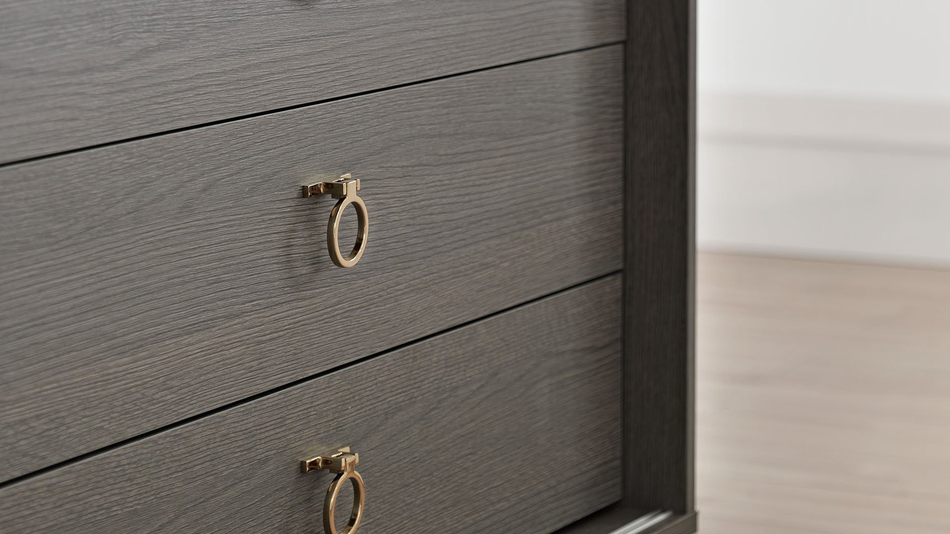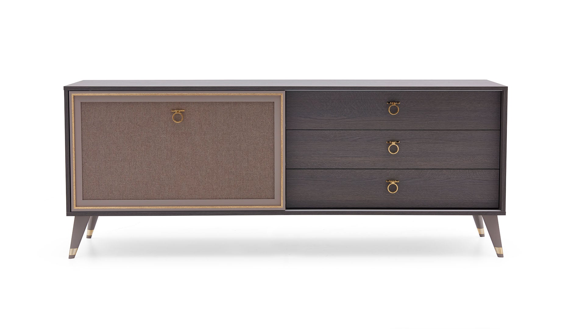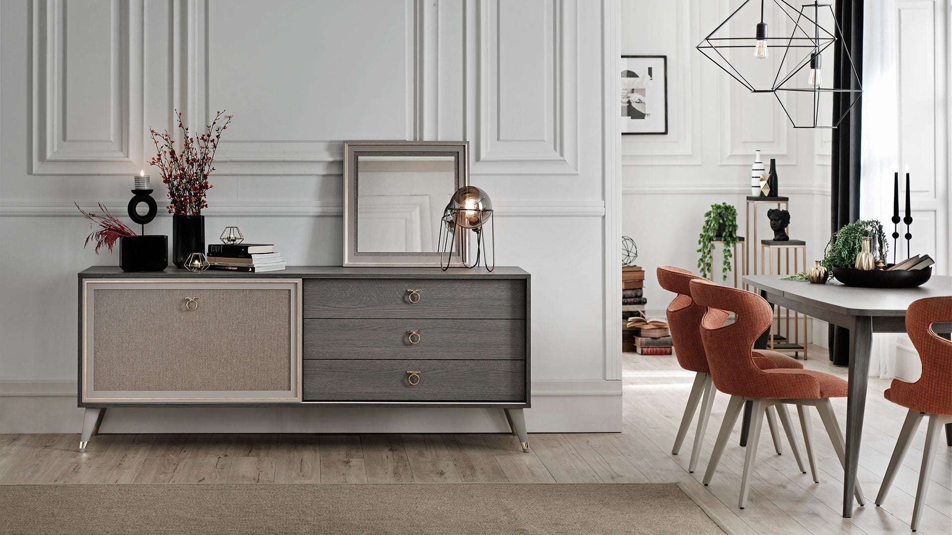 Découvrez la console Hector, dont le design est unique jusque dans les moindres détails. Ce meuble élégant, associant différents matériaux, est complété par des poignées en forme d'anneau et des pieds élégants. D'élégants détails dorés subliment son esthétique. Si vous recherchez une console pratique et élégante pour votre salle à manger, optez pour la console Hector.