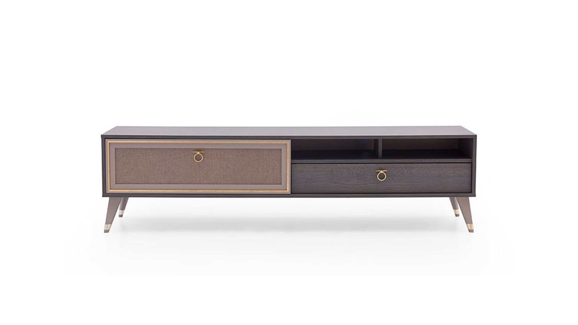 Couleur : Anthracite-Chêne-Toile Marron, Largeur : 206 cm, Profondeur : 48 cm, Hauteur : 54 cm, Poids total du produit : 57,4 kg, Matériau des pieds : Plastique, Couleur des pieds : Anthracite-Chêne-Doré, Hauteur des pieds : 13 cm