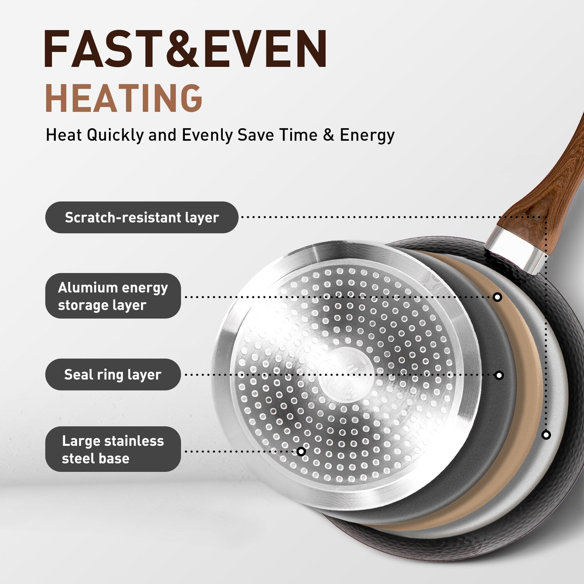 - L'ensemble comprend des poêles à frire de 8,15 pouces et 9,75 pouces, des casseroles de 1,5 pinte et 3 pintes avec couvercles, des cocottes de 3 pintes et 5 pintes avec couvercles et 5 ustensiles en nylon