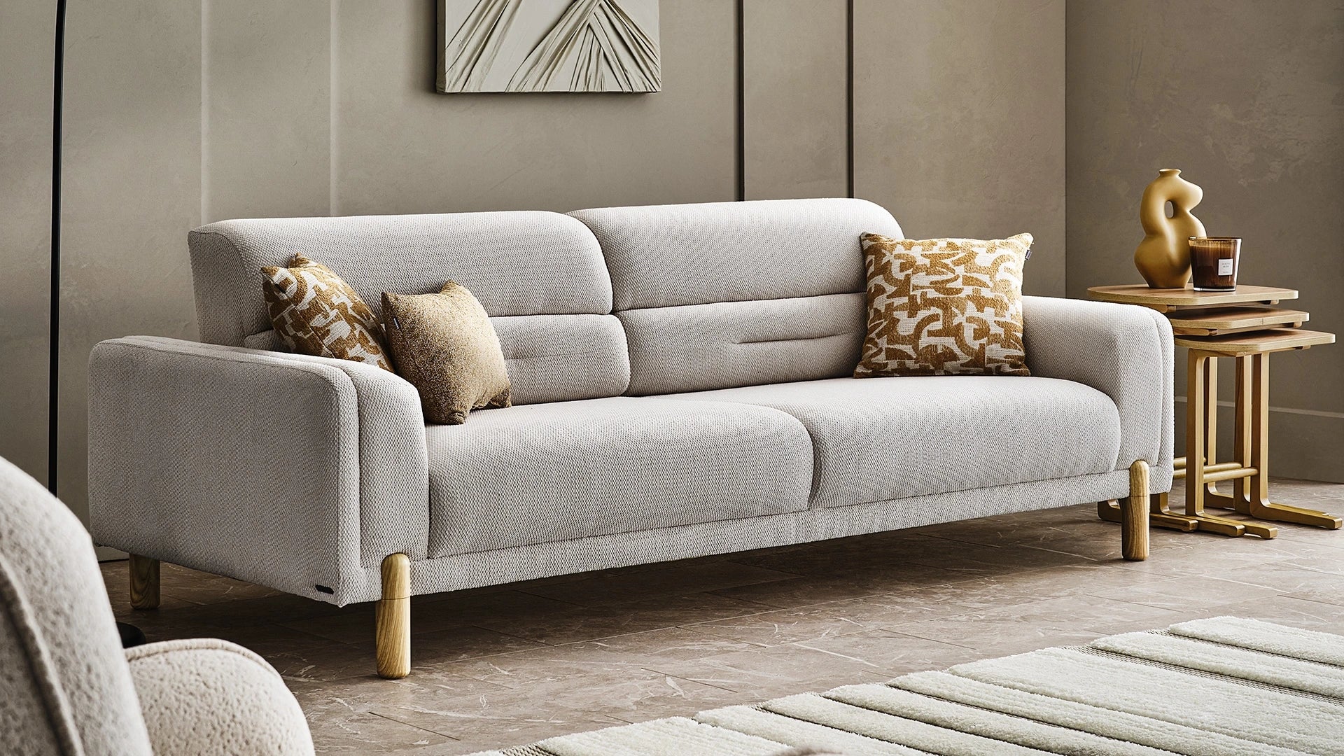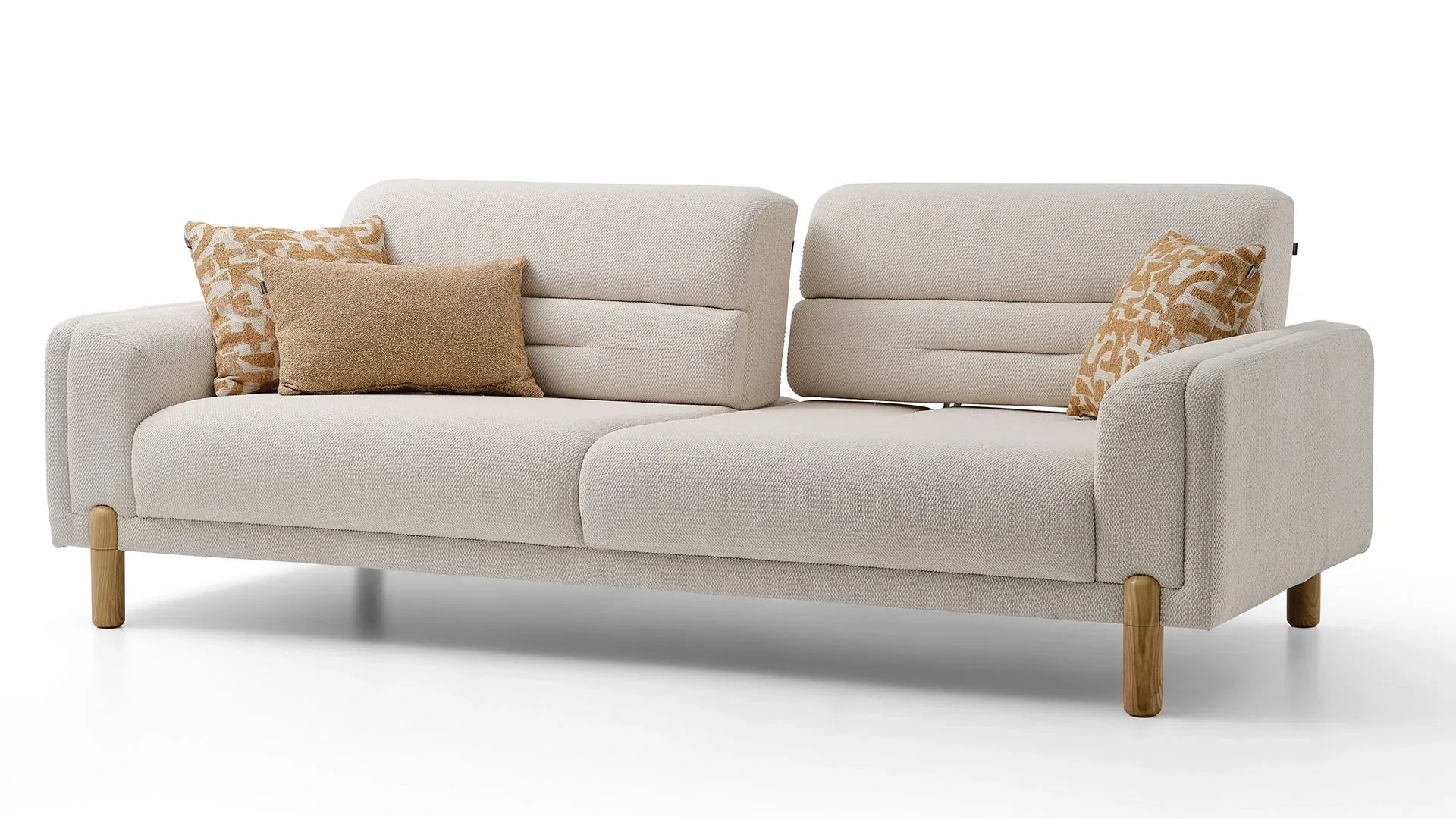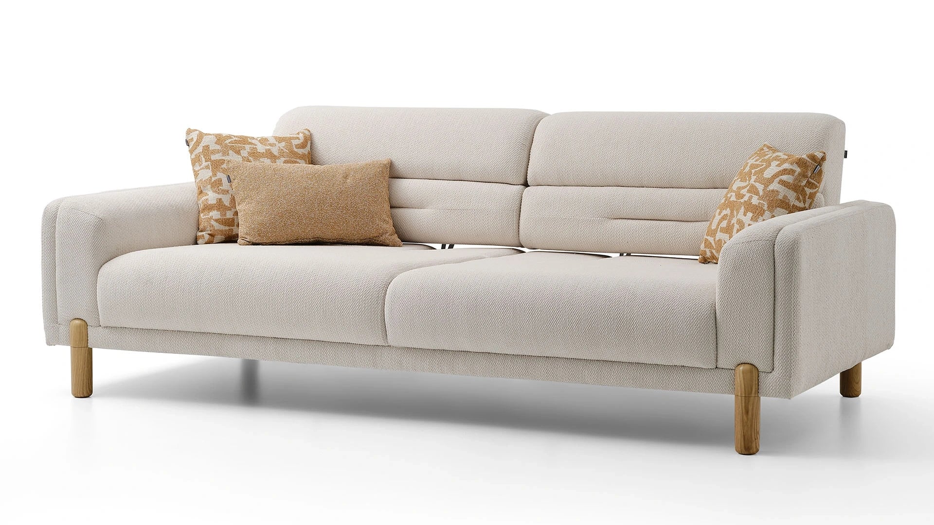 Le canapé-lit 3 places Legna allie esthétique chaleureuse et fonctionnalité au quotidien. Revêtu de tissu chenille crème et soutenu par des pieds en polymère couleur chêne, il offre une assise moelleuse et des lignes épurées et structurées. Son dossier rabattable permet de le transformer facilement en lit, idéal pour recevoir des invités ou pour des soirées détente. Un ensemble de coussins crème à motifs apporte une touche décorative subtile à ce meuble élégant et pratique.