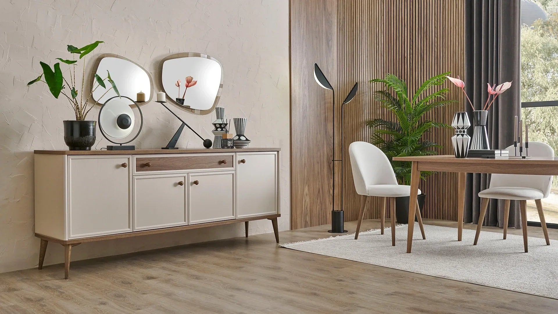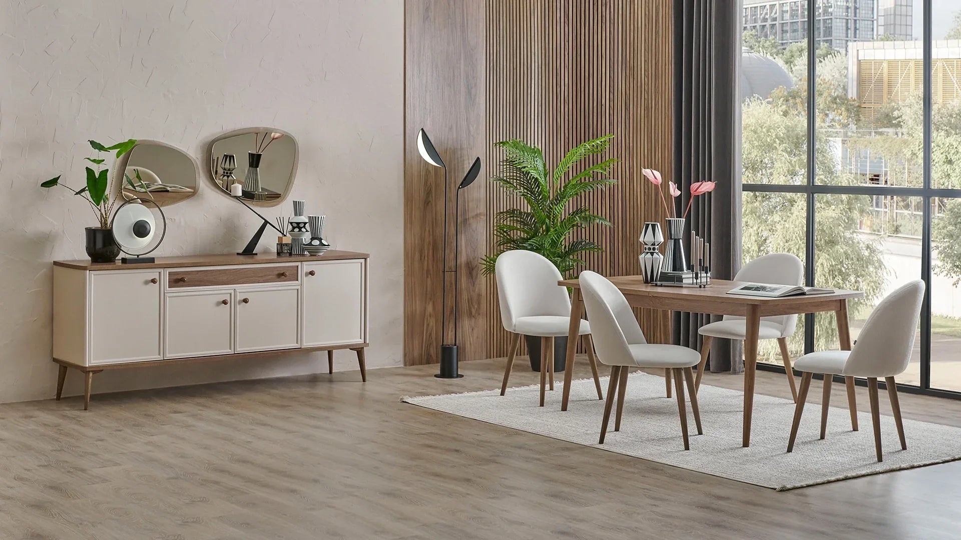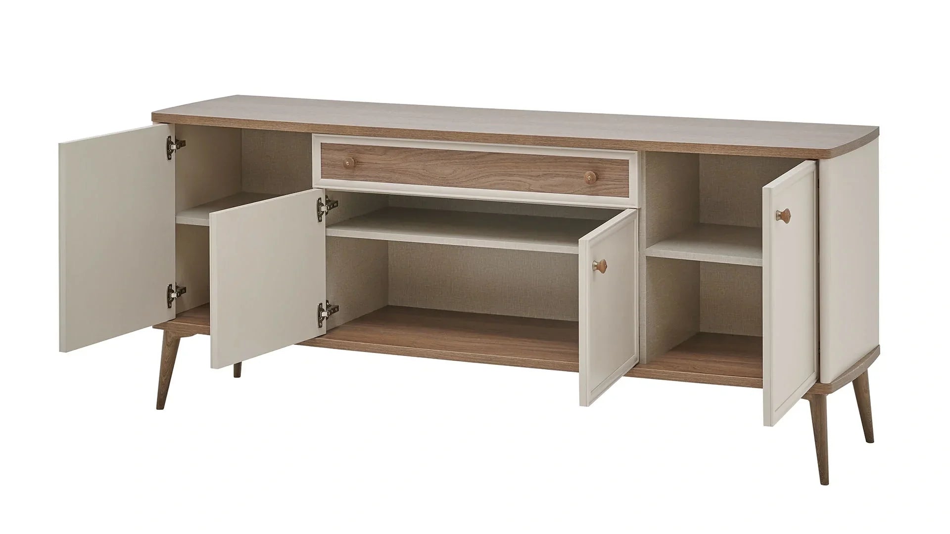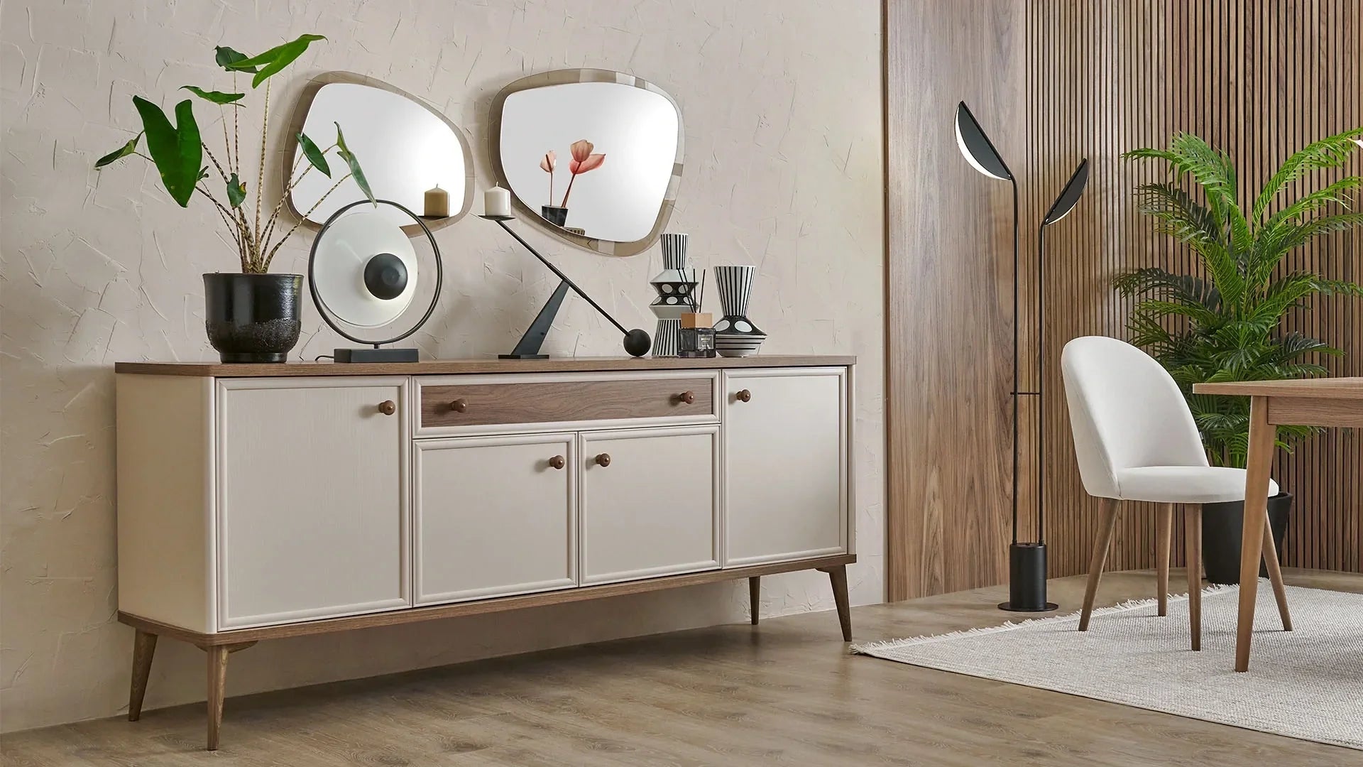 Le buffet Margo offre une solution de rangement élégante et fonctionnelle pour votre salle à manger. Son plateau spacieux offre également un espace de présentation idéal pour vos objets décoratifs. Doté de quatre portes et d'un tiroir, ce buffet vous permet d'organiser vos essentiels de table tout en sublimant votre espace grâce à son aspect clair et aéré.