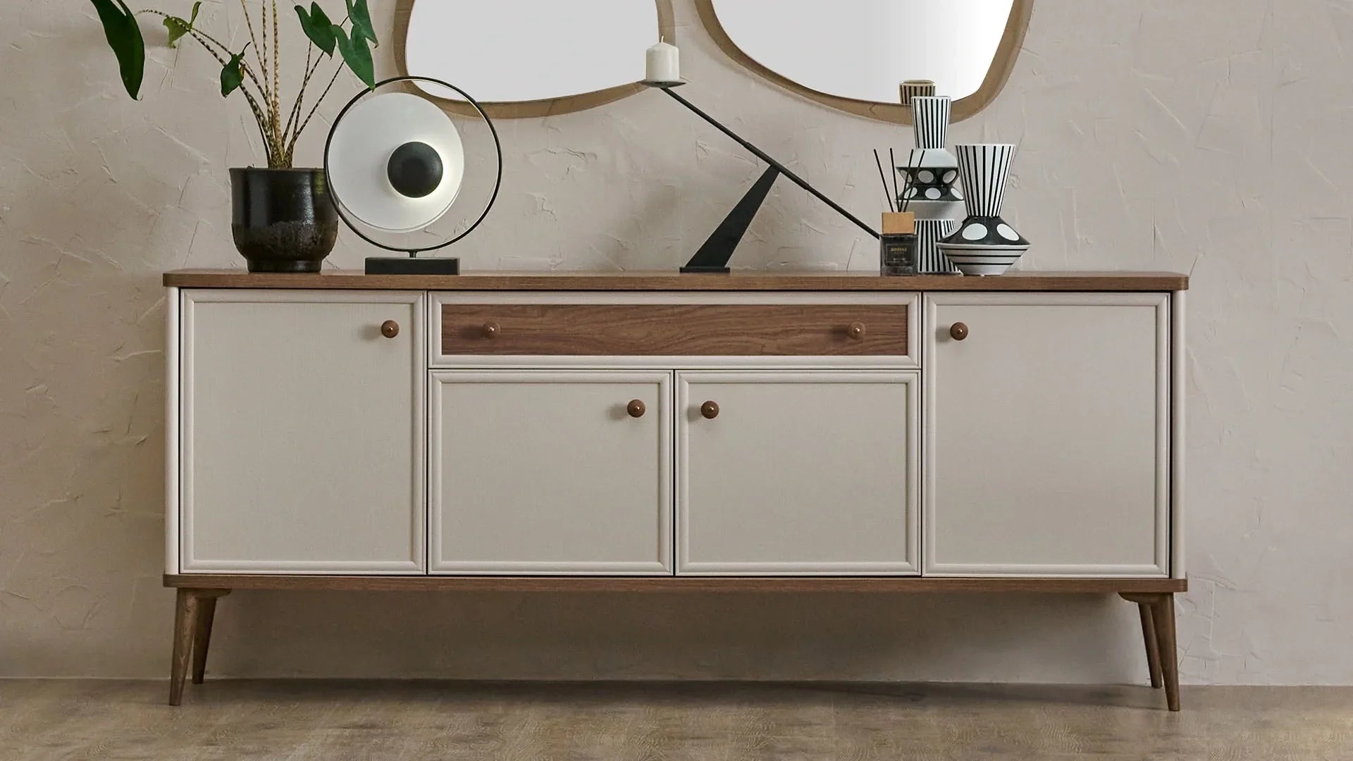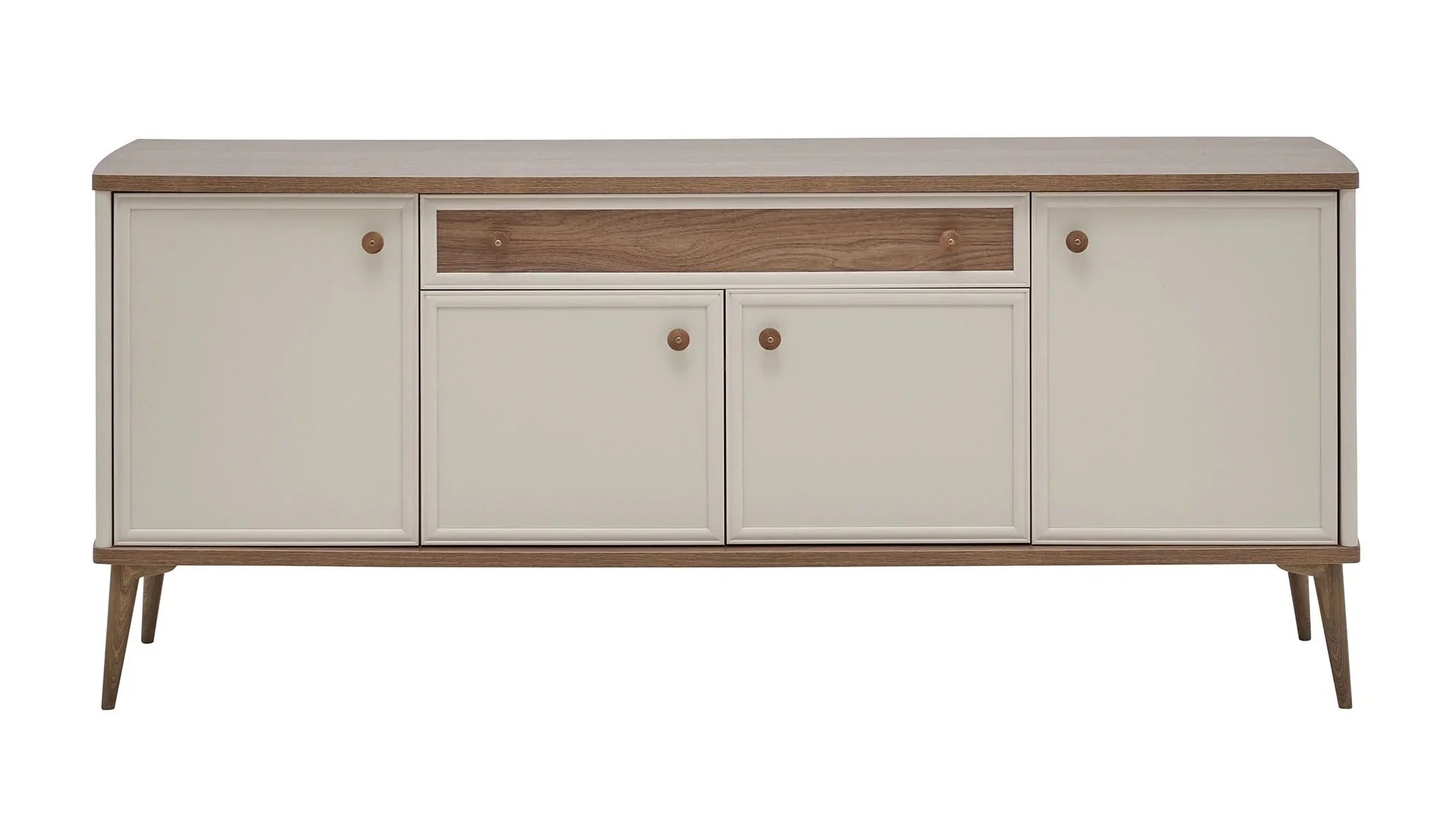 Fabriqué dans des tons chêne et beige, le buffet Margo apporte luminosité et sérénité à votre intérieur. Ses pieds surélevés en plastique contribuent non seulement à son esthétique moderne, mais facilitent également le nettoyage en dessous. Complétez votre salle à manger avec le buffet Margo, élégant et pratique.
