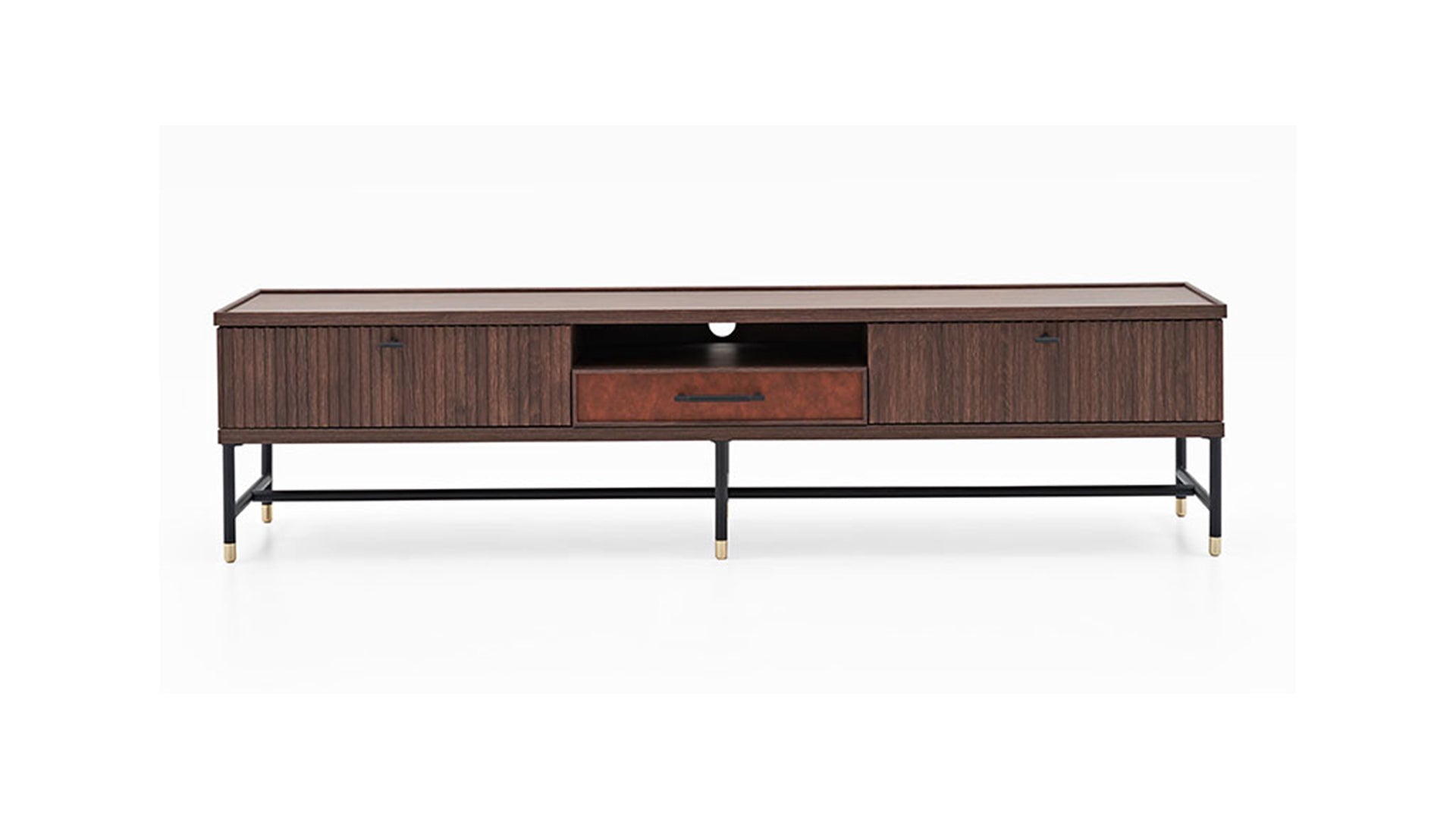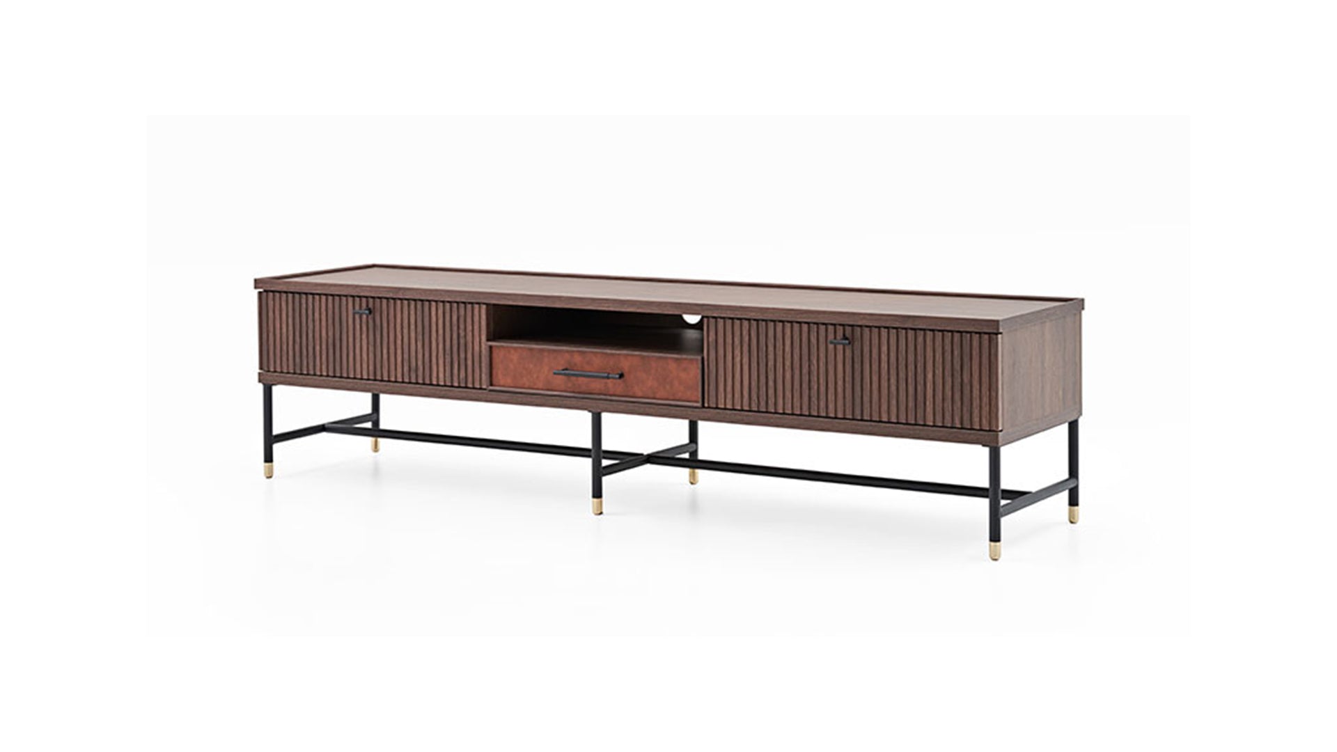 Le module inférieur du meuble TV Matilda est idéal pour ceux qui souhaitent créer une décoration originale grâce à son design élégant. Ce meuble caractéristique, alliant bois foncé et métal noir, personnalise votre espace de vie avec précision. Vous pouvez l'acheter seul ou avec d'autres modules.