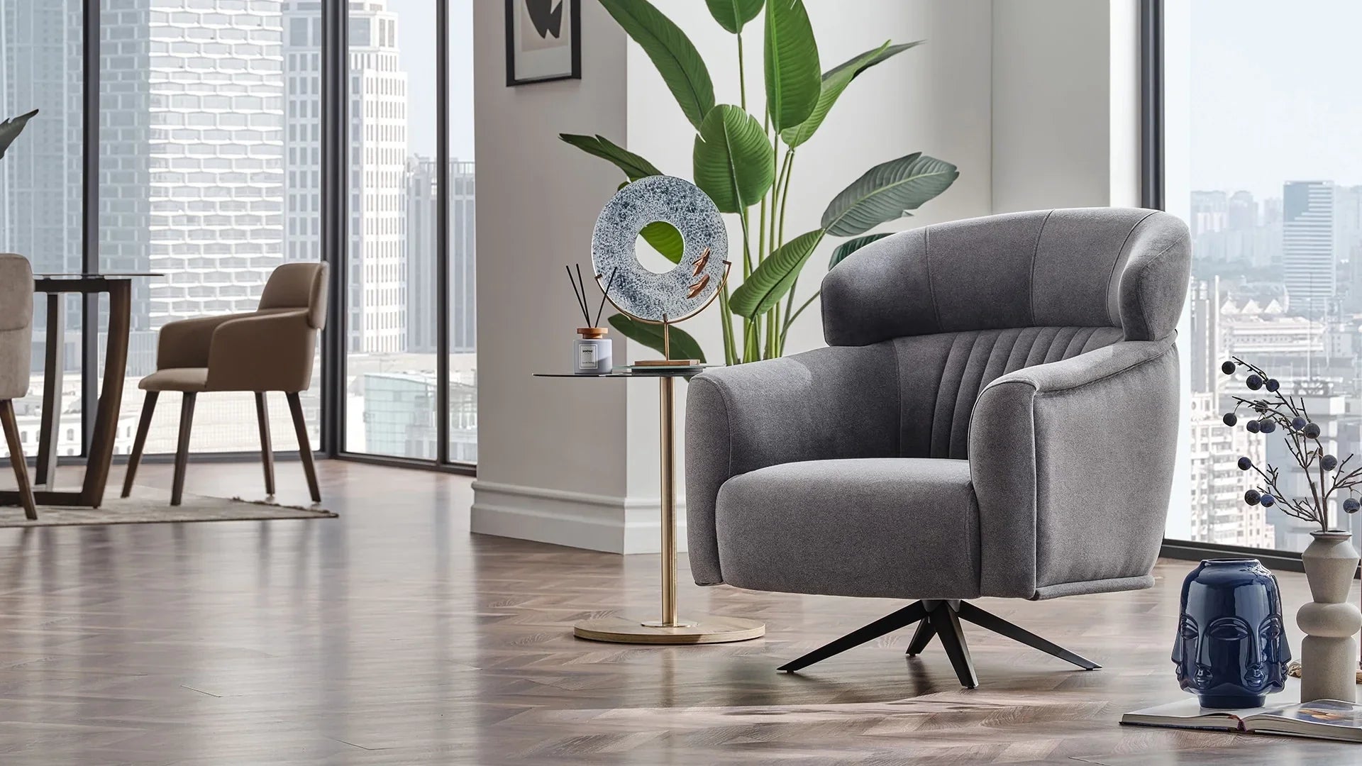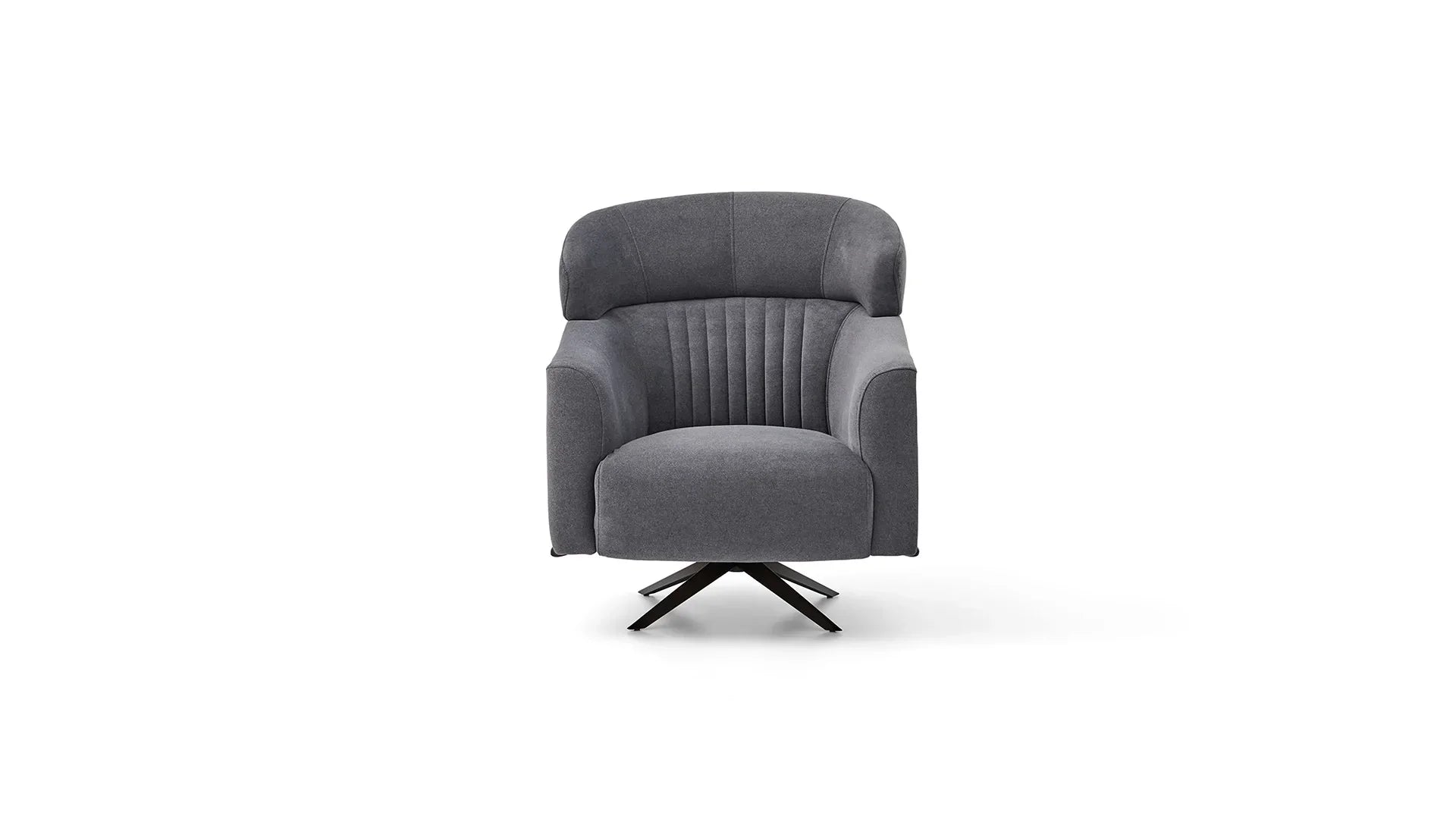 Le fauteuil pivotant Nevada allie à la perfection élégance moderne et confort ergonomique. Revêtu d'un doux tissu gris texturé velours, ce fauteuil présente une silhouette élégante, des surpiqûres subtiles et un piètement pivotant offrant une grande liberté de mouvement. Ses pieds en métal noir et son assise bien rembourrée en font un ajout élégant et pratique à toute pièce.