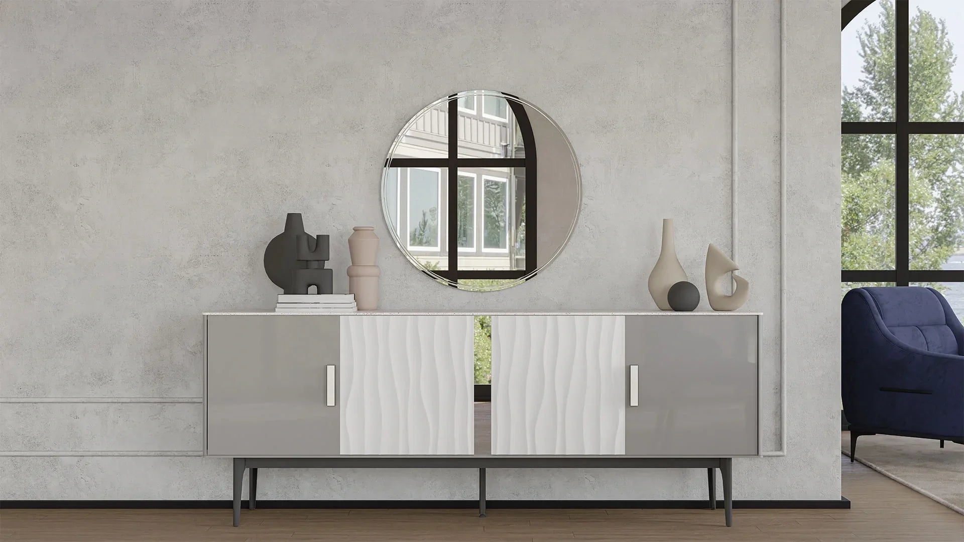 Avec ses motifs de portes sculpturaux et ses détails en miroir modernes, le buffet Nita apporte une élégance raffinée et un rangement intelligent à votre maison, parfait pour ceux qui apprécient le design contemporain avec une touche audacieuse.