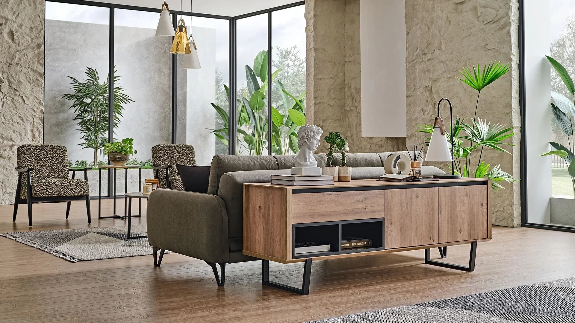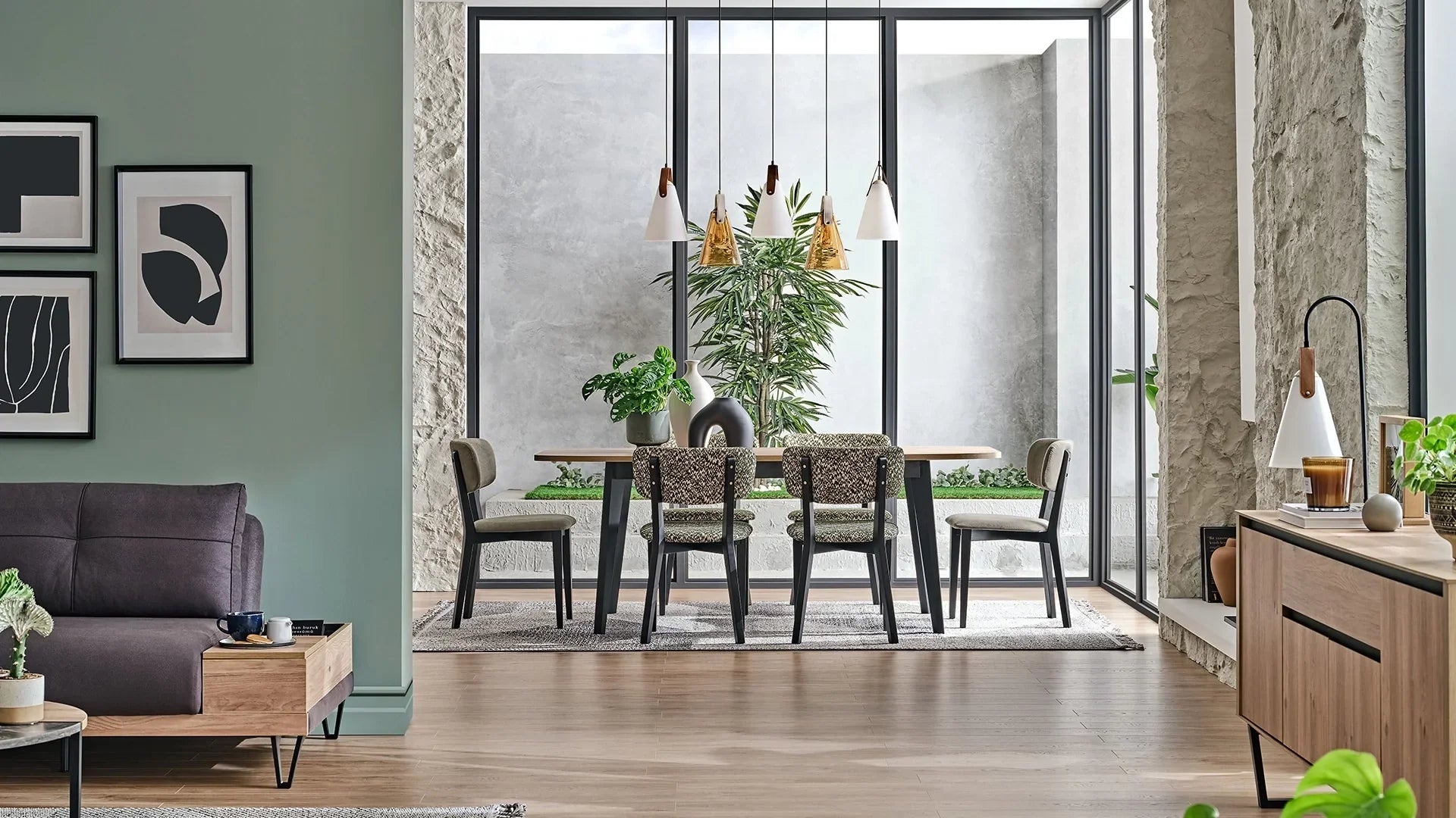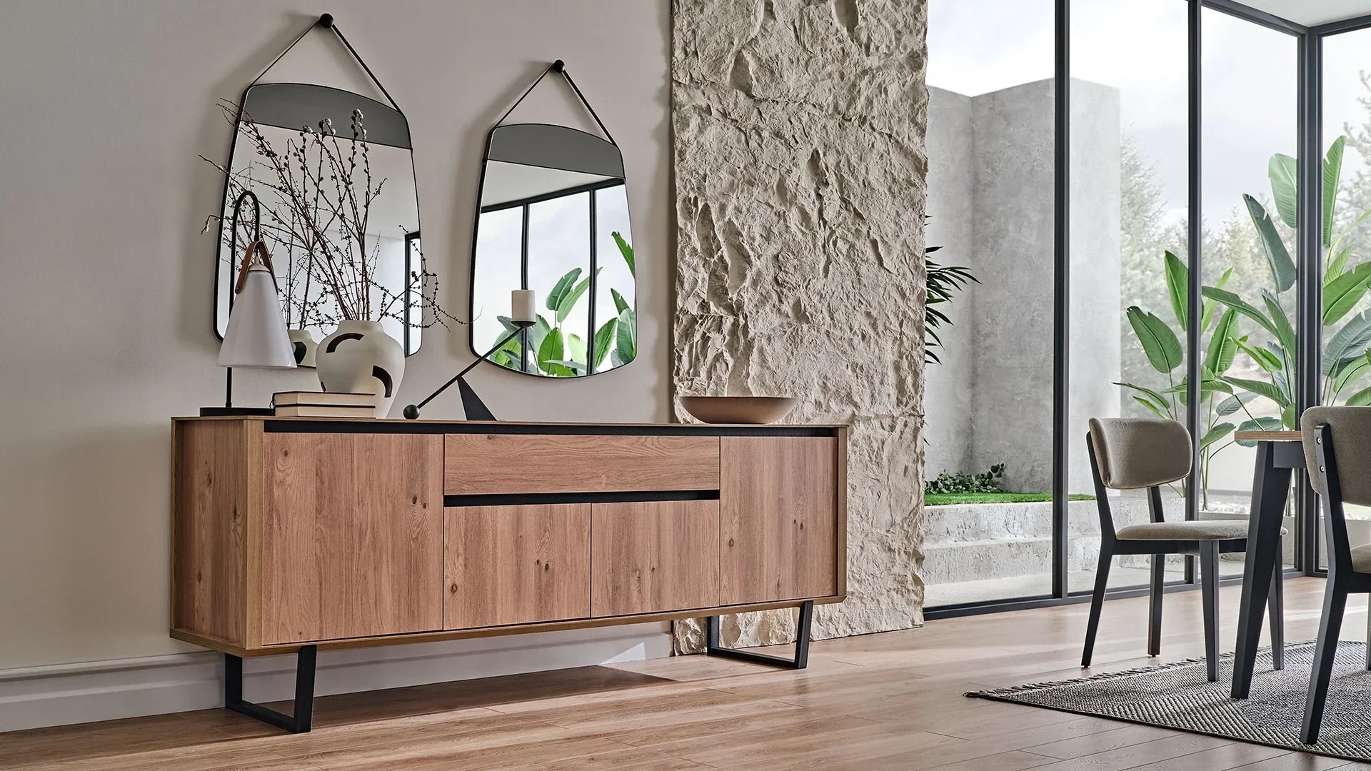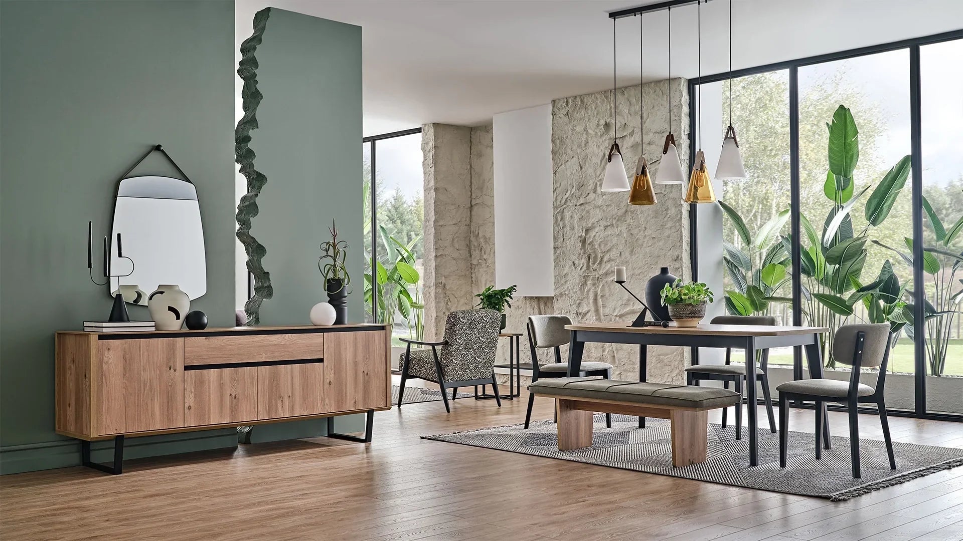 L'ensemble de salle à manger Solid allie harmonieusement la chaleur naturelle du bois couleur Varna à la présence affirmée du métal, sublimant votre espace par sa fonctionnalité et son design élégant. Ce modèle reflète un goût raffiné grâce à ses armoires sans poignées, ses pieds hauts et ses lignes épurées. Avec sa table extensible, l'ensemble de salle à manger Solid séduit également les familles nombreuses. Chaque détail reflète une approche minimaliste et simple de la décoration. Composée d'une console de rangement spacieuse, d'une grande table à manger moderne, de miroirs au design unique et de chaises élégantes aux motifs distinctifs, cette collection apportera une nouvelle énergie à votre espace de vie. Vous pouvez enrichir votre ensemble de salle à manger avec d'autres modules de la collection Solid, allant des tables basses et meubles TV aux commodes et bancs.