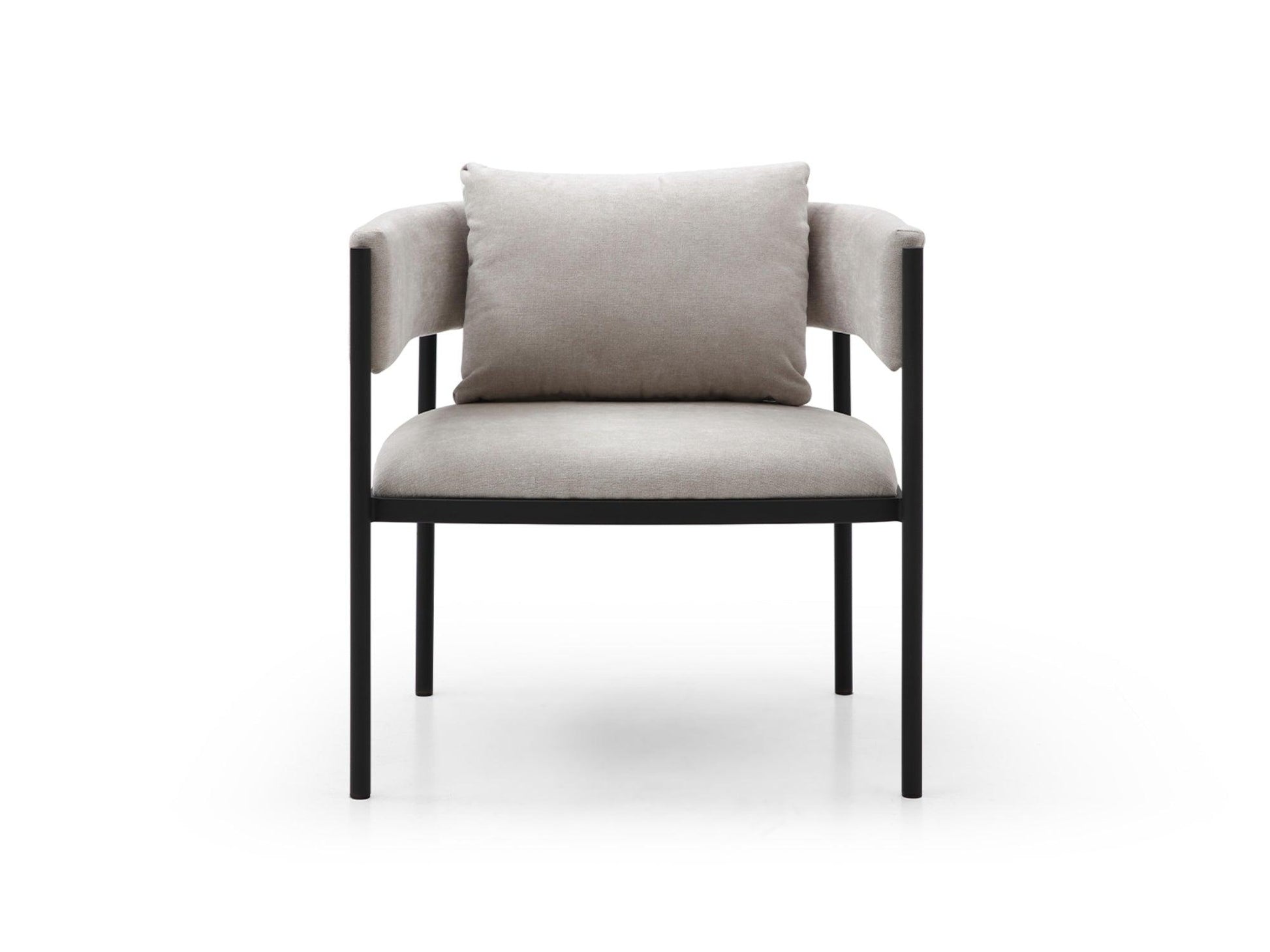 La chaise d'appoint Sonnie est livrée avec un tissu gris clair et un cadre en acier enduit de ponçage noir.