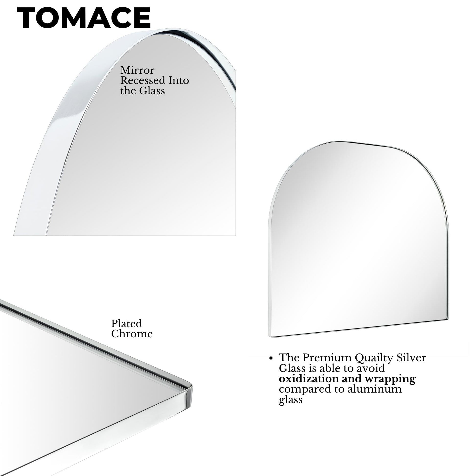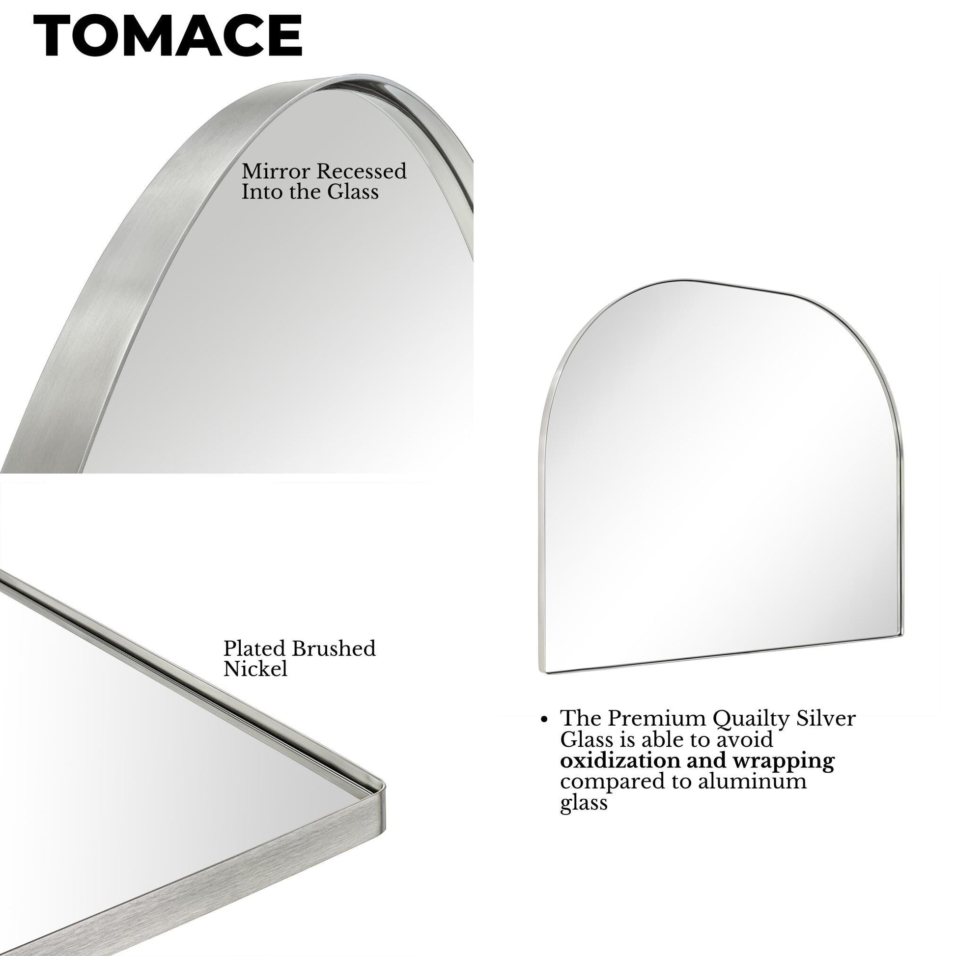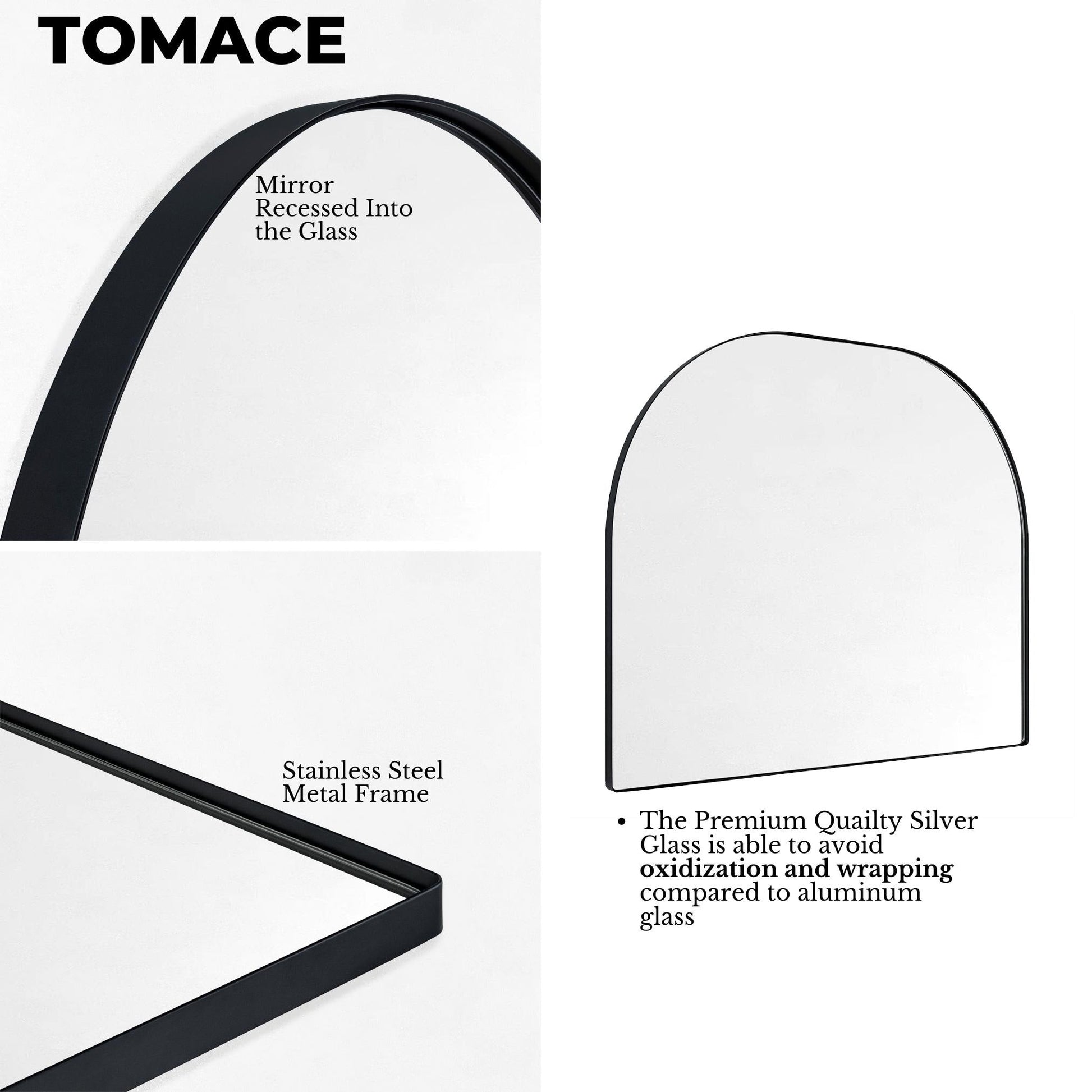- Cadre en acier inoxydable sans soudure : ce miroir de salle de bain arqué utilise un matériau en acier inoxydable de qualité supérieure et un support en MDF certifié TSCA de 9 mm pour éviter la rouille et la corrosion lors du montage mural, ce qui le rend également sûr pour une utilisation dans la salle de bain.
