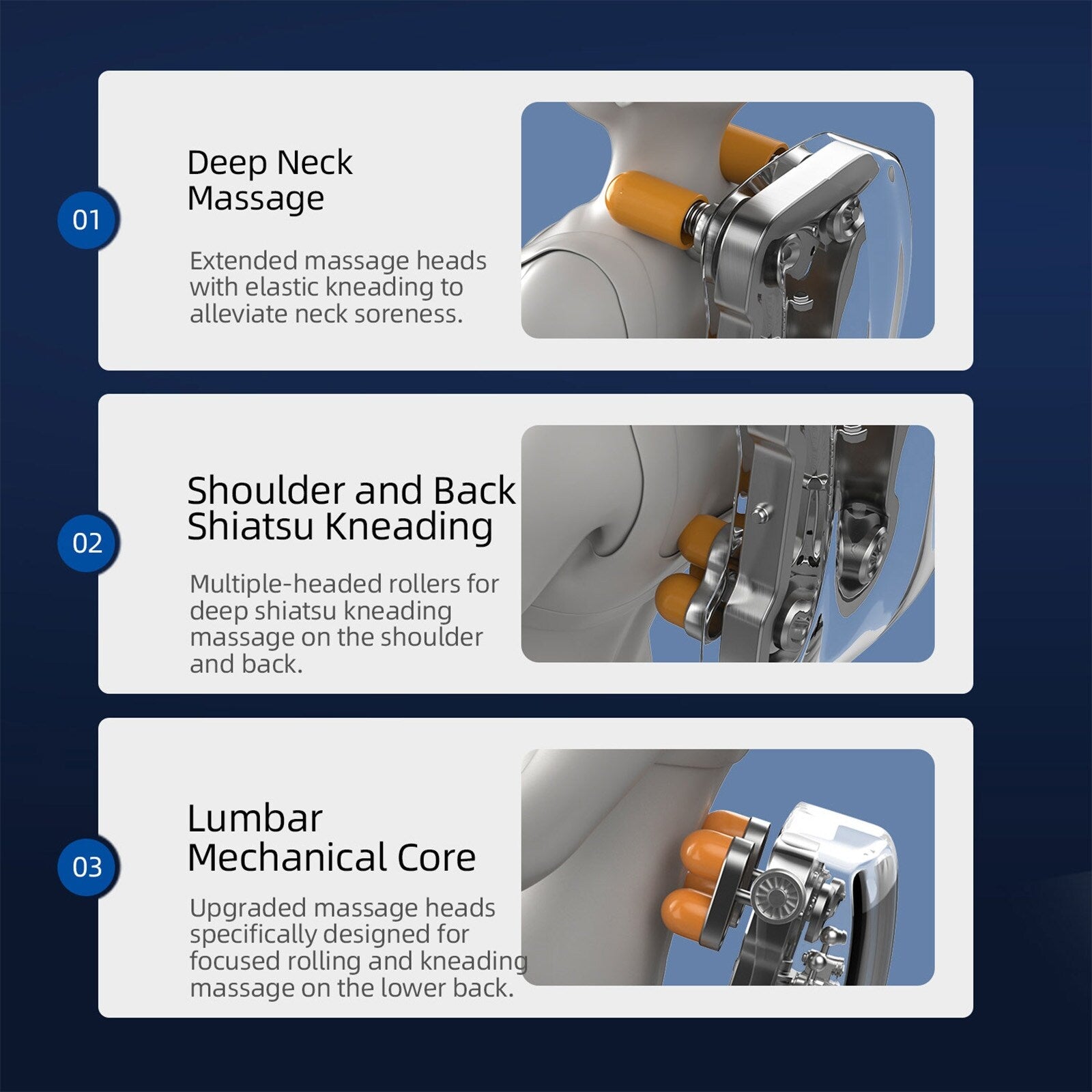 - 5 techniques de massage : Profitez de styles de massage de qualité professionnelle, notamment le pétrissage, le shiatsu, les applaudissements, les tapotements et les coups , adaptés à vos besoins de relaxation.